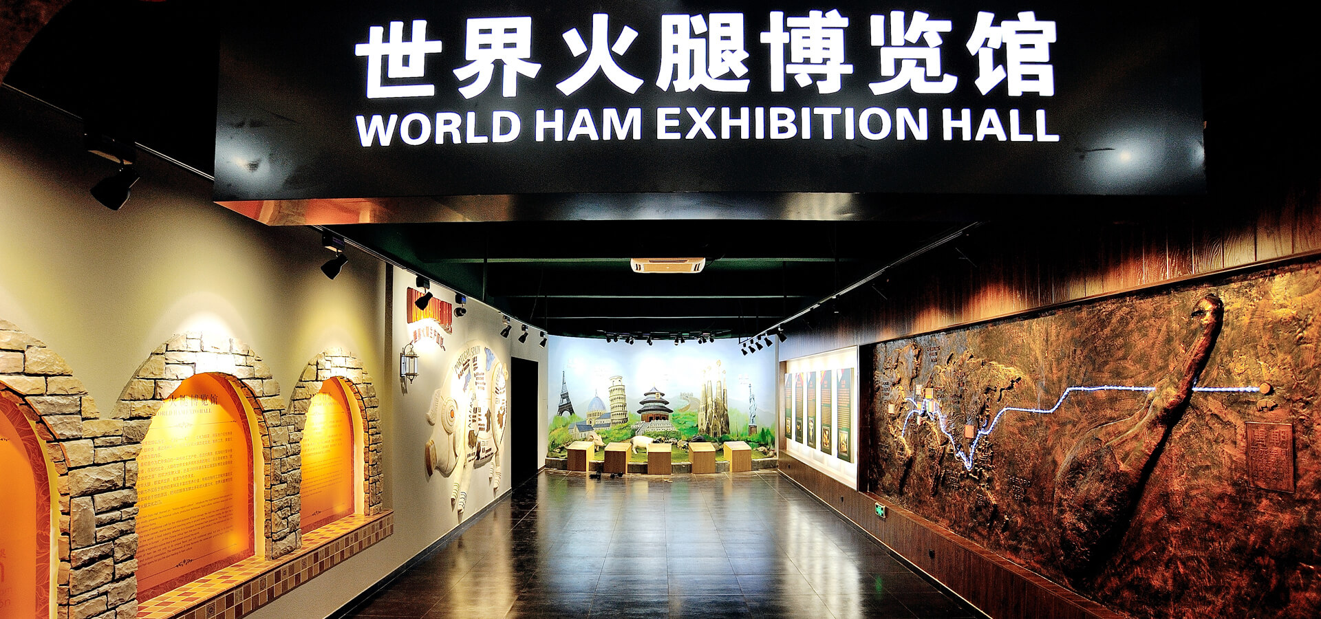 世界火腿博覽館是一個以世界火腿為主題的博覽館,用歷史-地域-工藝-文化為線索,通過展板、照片、聲光和布景等手法,翔實(shí)介紹了中國金華火腿、西班牙伊比利亞火腿、意大利帕爾瑪火腿、法國科西嘉火腿和巴黎火腿、美國的鄉(xiāng)村火腿等世界知名火腿的歷史人文,消費(fèi)習(xí)俗、制作工藝、火腿美食等。