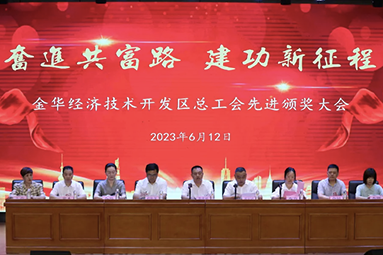 日前,6月12日下午,金華開發(fā)區(qū)總工會在李漁小學報告廳召開“奮進共富路,建功新征程”先進頒獎大會。經(jīng)申報、推薦、審查、評審和公示等環(huán)節(jié),我單位陳順通、姜濤二位員工榜上有名。生產(chǎn)副總監(jiān)陳順通被授予2023年度“八婺金匠”榮譽稱號,生產(chǎn)副總監(jiān)姜濤被授予2023年“金開工匠” 榮譽稱號。